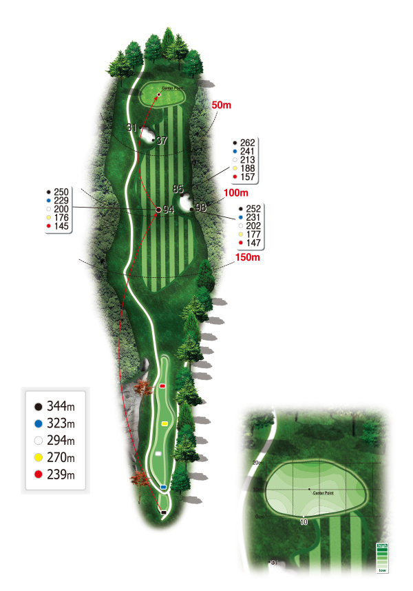 티샷은 좌측벙커로 겨냥하는 것이 안전하고 페어웨이 중앙공략을 공략해도 괜찮다. 그린까지 가파른 오르막에 굴곡도 매우 심하므로 세컨샷이 짧았을 경우 온그린하더라도 그린 앞쪽으로 흘러내려오는 경사이므로 두 클럽정도 크게 공략을 해야 한다.