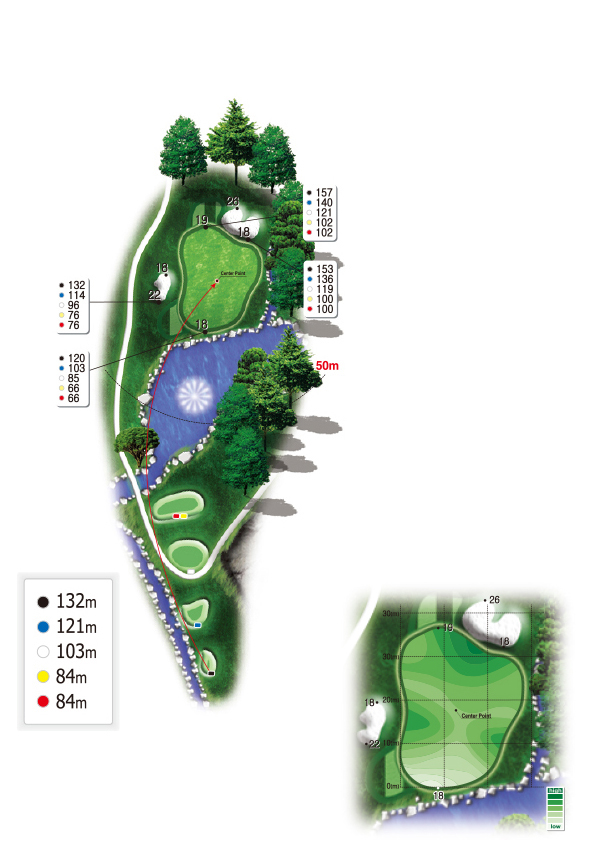 - 짧은 거리 파3홀로 그린 앞 전면에 대형 해저드가 있으나 시각적으로 그리 위협적이지 못하다. 그러나 티샷은 가급적 표시거리보다 넉넉하게 잡는 것이 샷이 미스가 나더라도 다행히 온그린이 될 수 있는 행운을 가질 수 있다.
