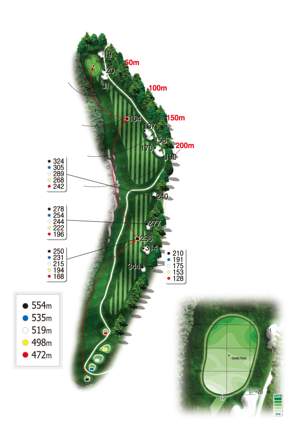 - 좌도그랙 가파른 내리막 긴 거리 파5홀로 모든 샷을 다 잘해야만 레귤러 온그린이 가능하므로 매샷 거리보다 정교함이 필요하다.