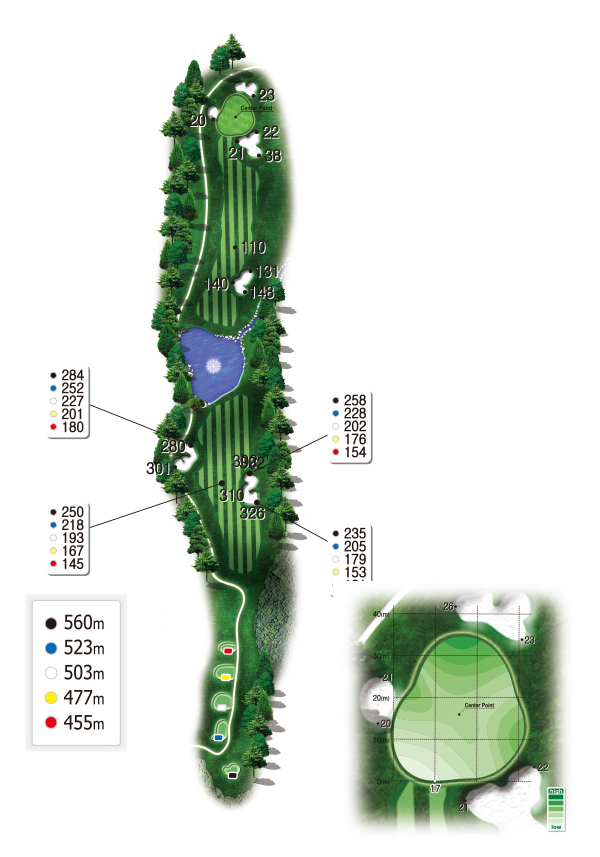 티샷은 멀리 보이는 해저드 앞에 위치한 작은 소나무를 겨냥하면 중앙에 안착이 된다. 세컨샷은 긴 클럽으로 공략하는 것이 중요하다. 그린 앞, 뒤로 커다란 벙커가 쉽게 온 그린을 허용하지 않는다.
