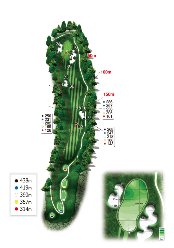 - 약간 내리막에 좌로 휘어지고 거리마저 매우 긴 홀로 티샷부터 최대한 멀리 보내야 하는 어려운 파4홀이다. 티샷은 멀리 그린 우측 벙커방향으로 보내면 페어웨이 중앙에 안착이 된다.