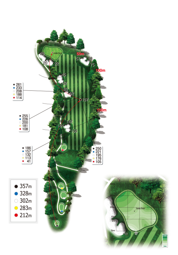 오르막 포대형 그린으로 세컨샷이 짧으면 높고 가파른 오르막 어프로치 어려움이 남는다. 그린은 좌우가 낮고 중앙과 상단이 높다.